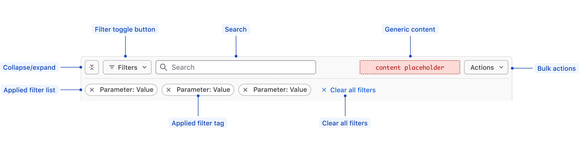 The Filter Bar is used to display and apply filters to a data set. It is most often used in conjunction with the Advanced Table, but is flexible enough to support different renderings of data sets such as in a list or grid of cards.