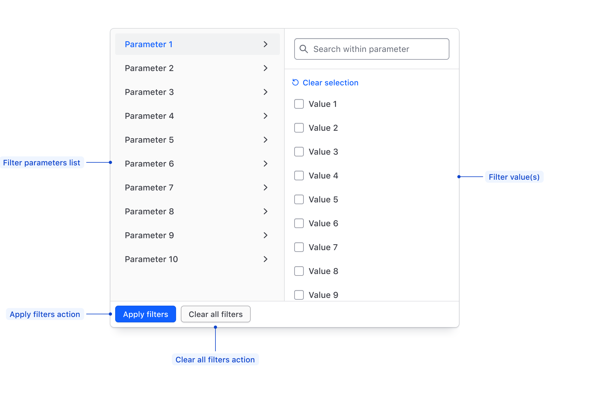 | Clear all filters action | Clears the selection of filters across all parameters. |