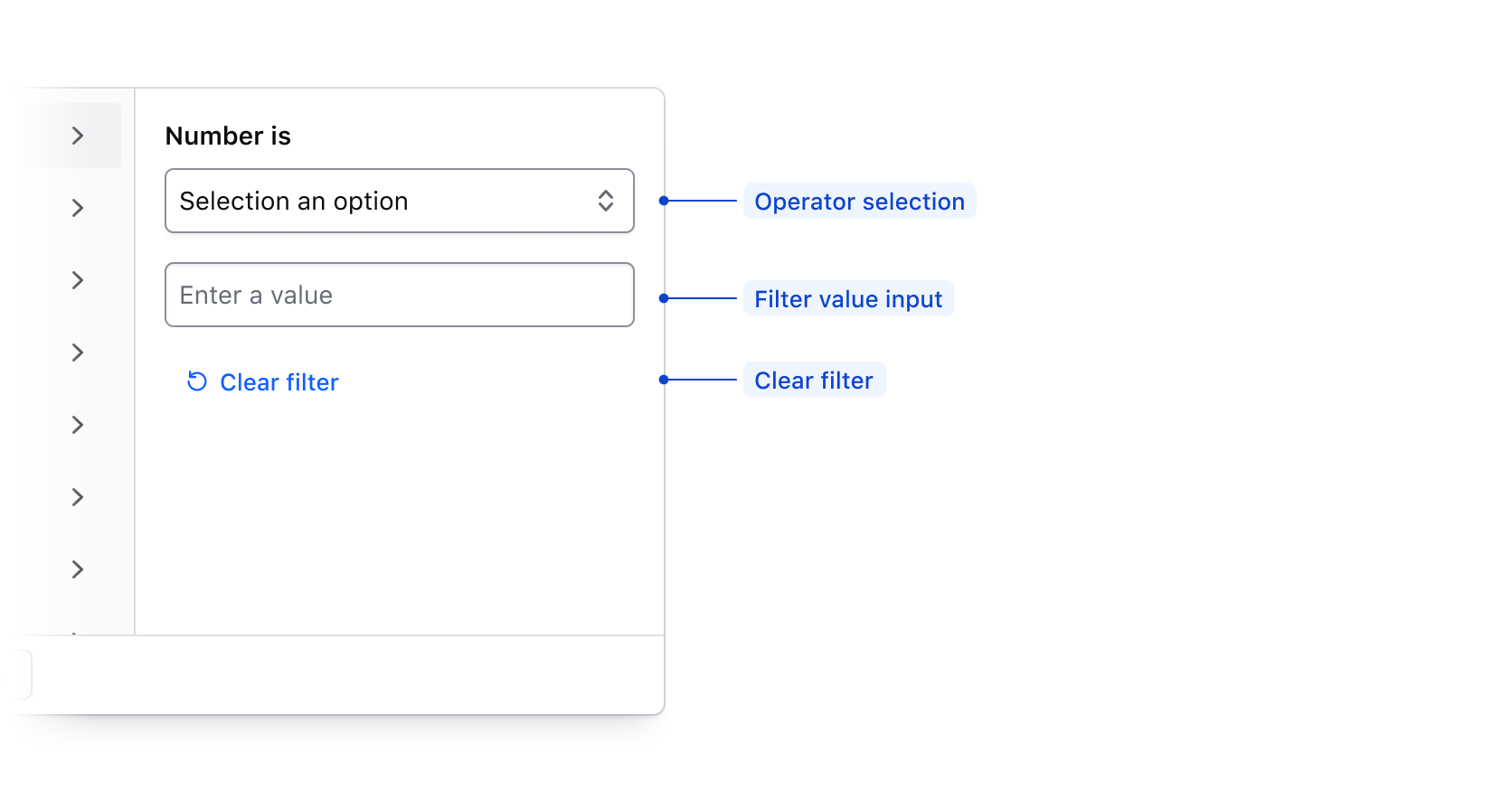 | Value input | Allows the user to input a custom value to filter upon such as a number, string, date, or time. |