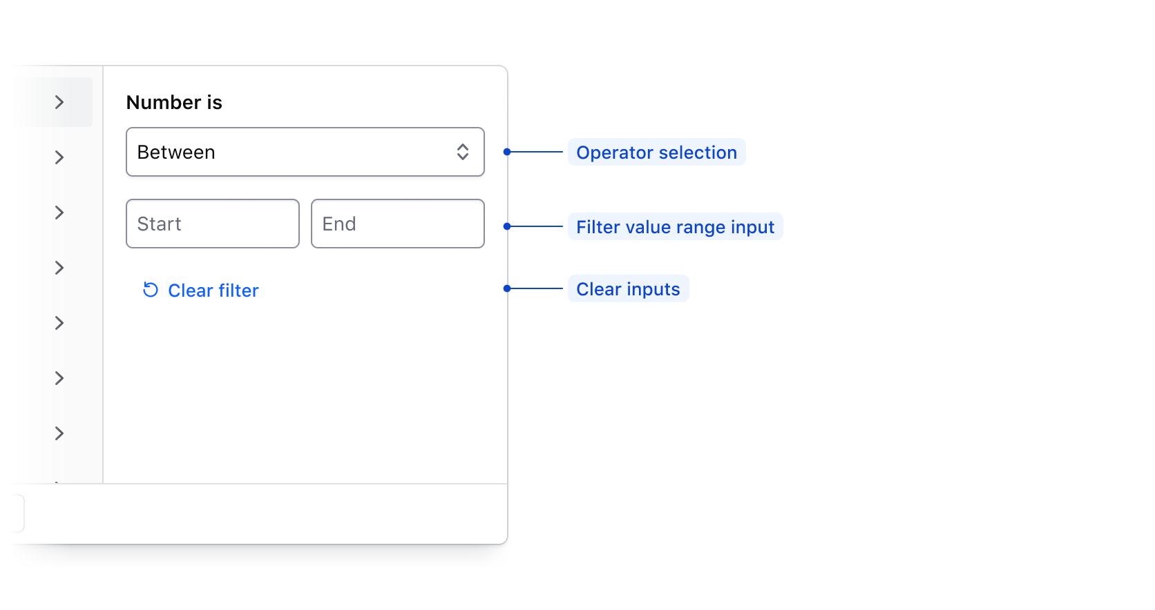| Value range input | Allows the user to input a start and end value to filter upon. |