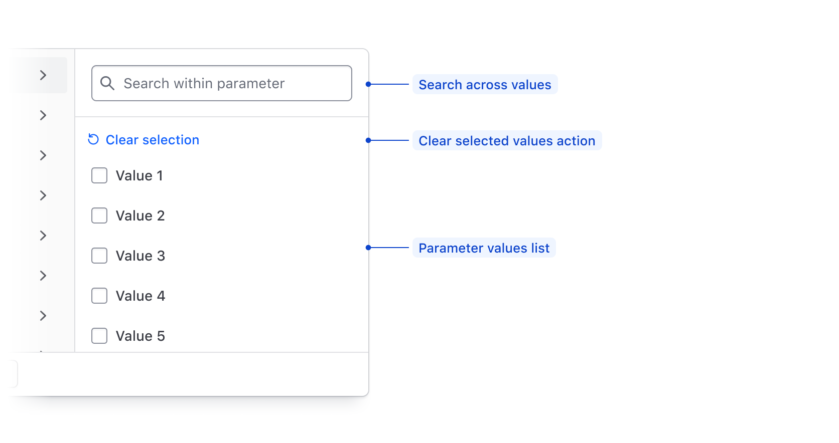 | Filter value(s) | Displays available values within a parameter for selection, or allows the input of custom values. |