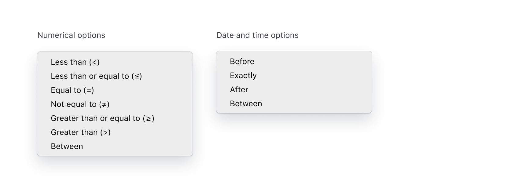 | Numerical | Less than (>), Less than or equal to (≤), Equal to (=), Not equal to (≠), Greater than or equal to (≥), Greater than (>), Between |